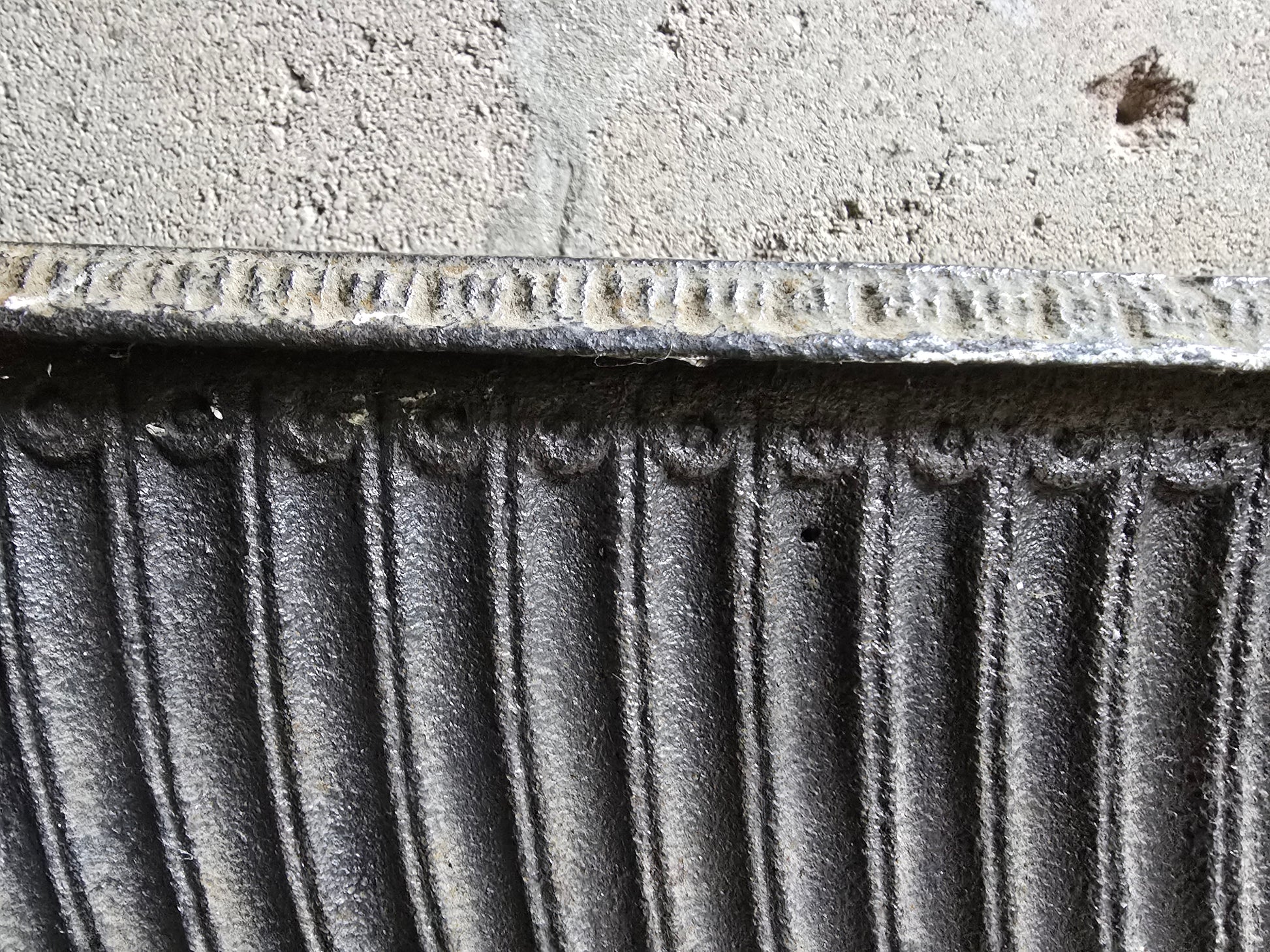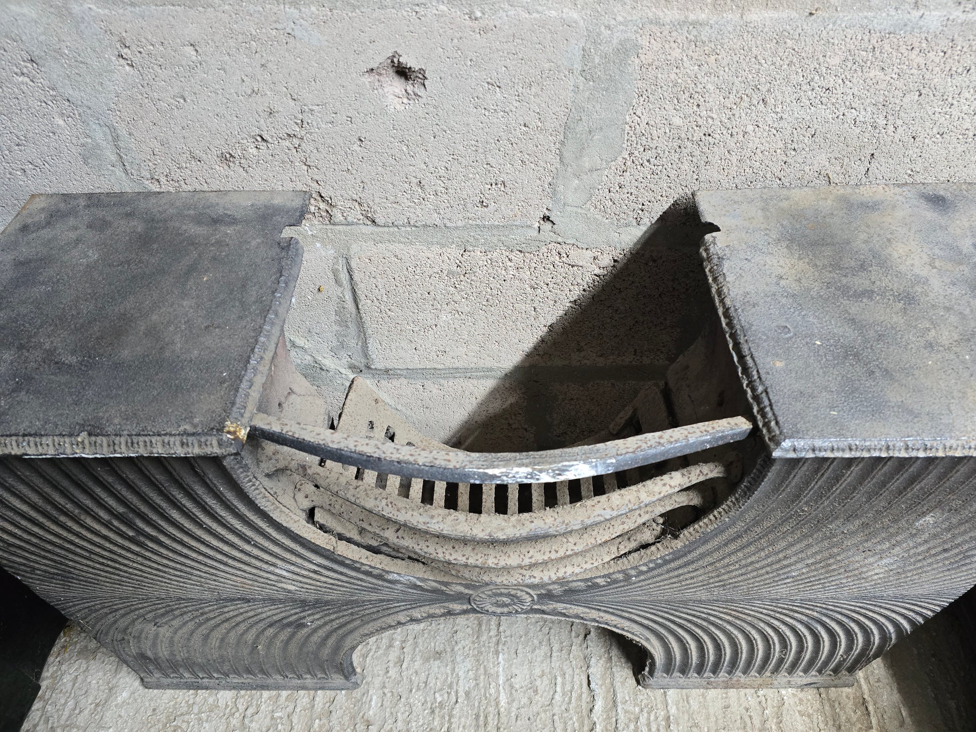 The shaping and ornament are particularly attractive, with the sweeping lines across the front giving it far more movement and elegance than a plainer grate. A genuine piece of antique fireplace history with strong visual impact.